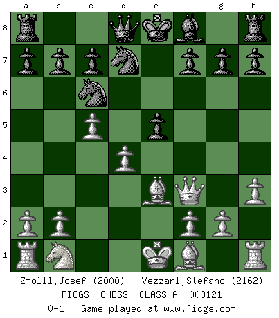 Last move : 0-1 2012 October 12 19:9:46 [Event "FICGS__CHESS__CLASS_A__000121"] [Site "FICGS"] [Date "2012.05.11"] [Round "1"] [White "Zmolil,Josef"] [Black "Vezzani,Stefano"] [Result "0-1"] [WhiteElo "2000"] [BlackElo "2162"] 1.e4 d5 2.exd5 Nf6 3.d4 Nxd5 4.c4 Nb6 5.Nf3 Bg4 6.c5 N6d7 7.h3 Bxf3 8.Qxf3 Nc6 9.Be3 e5 0-1 Scandinavian : Marshall variation Player Black won this chess game. Follow this game move after move (download)Chess is as much a mystery as women. (Purdy) Der 70jährige Viktor Kortschnoi: Die Rentenanstalt wollte mich zwingen in Rente zu gehen. Meine Frau erhält jetzt eine Pension- und ich zahle weiter in die Rentenkasse ein! (Viktor Kortschnoi) Todo lo que importa ante el tablero de Ajedrez son buenas jugadas. (Bobby Fischer) Pour moi, les échecs ne sont pas un jeu mais un art. (Alexandre Alekhine) Difficult things take a long time, impossible things a little longer. (Author unknown)