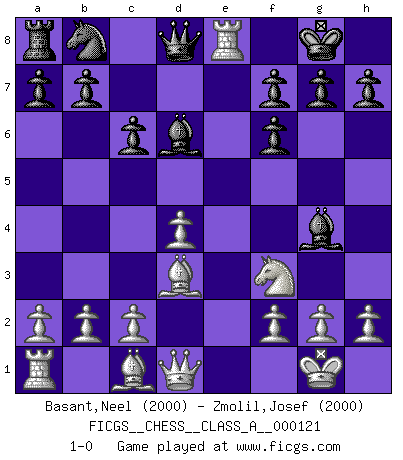Last move : 1-0 2012 November 28 23:14:37 [Event "FICGS__CHESS__CLASS_A__000121"] [Site "FICGS"] [Date "2012.05.11"] [Round "1"] [White "Basant,Neel"] [Black "Zmolil,Josef"] [Result "1-0"] [WhiteElo "2000"] [BlackElo "2000"] 1.e4 c6 2.Nf3 d5 3.Nc3 dxe4 4.Nxe4 Nf6 5.Nxf6+ exf6 6.d4 Bd6 7.Bd3 O-O 8.O-O Bg4 9.Re1 Re8 10.Rxe8+ 1-0 This chess game has been lost on time (started : 2012.05.11 10:15:15) Caro-Kann defense Kingside Castling by player Black (move 7) Kingside Castling by player White (move 8) Player White won this chess game. Follow this game move after move (download)In Chess, at least, the brave inherit the earth. (Edmar Mednis) Ein unbeabsichtigtes Patt ist der Gipfel der Dummheit. (Anonymous) Durante una competencia de Ajedrez, un Maestro de Ajedrez deberá ser una combinación de presa de caza y un Monge. (Alexander Alekhine) Ce qui caractérise les parties de combat, c'est que si le défenseur a constamment de difficiles problèmes à résoudre, l'attaquant doit chercher sans relâche de nouvelles possibilités d'attaque. (Koblentz) The next best thing to gambling and winning is gambling and loosing. (Nick Dandalos)