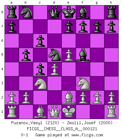 Last move : 0-1 2012 November 8 22:23:31 [Event "FICGS__CHESS__CLASS_A__000121"] [Site "FICGS"] [Date "2012.05.11"] [Round "1"] [White "Puzanov,Vasyl"] [Black "Zmolil,Josef"] [Result "0-1"] [WhiteElo "2120"] [BlackElo "2000"] 1.d4 d5 2.c4 c6 3.Nf3 Nf6 4.Nc3 dxc4 5.e4 b5 6.e5 Nd5 7.Be2 Bf5 0-1 This chess game has been lost on time (started : 2012.05.11 10:15:15) QGD Slav : Tolush-Geller gambit Player Black won this chess game. Follow this game move after move (download)Chess is not like life... it has rules ! (Mark Pasternak) Es gibt zwei Arten von Opfern: Korrekte und meine. (Mikhail Nekhemyevich Tal) Todos los jugadores de Ajedrez deberían tener un pasatiempo. (Savielly Tartakower) Je ne crois pas en la psychologie, je crois aux bons coups. (Robert Fischer) Two beer, or not two beer. (Unknown)