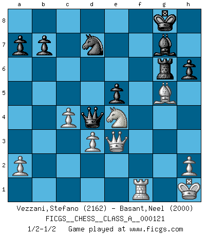 Last move : 1/2-1/2 2012 December 15 11:35:52 [Event "FICGS__CHESS__CLASS_A__000121"] [Site "FICGS"] [Date "2012.05.11"] [Round "1"] [White "Vezzani,Stefano"] [Black "Basant,Neel"] [Result "1/2-1/2"] [WhiteElo "2162"] [BlackElo "2000"] 1.f4 c5 2.Nf3 Nc6 3.g3 g6 4.Bg2 Nf6 5.O-O d5 6.d3 Bg7 7.Nc3 O-O 8.e4 d4 9.Nb1 e5 10.f5 Ne8 11.g4 Bd7 12.g5 gxf5 13.exf5 f6 14.Nbd2 fxg5 15.Nb3 Rxf5 16.Nxc5 Bc8 17.Bh3 Rf6 18.Bxc8 Rxc8 19.Bxg5 Rg6 20.Kh1 Qd5 21.Ne4 Nd6 22.Nfd2 Nb8 23.c4 dxc3 24.Qf3 Nxe4 25.Nxe4 Nd7 26.bxc3 Rf8 27.Qe3 Rxf1+ 28.Rxf1 h6 29.c4 Qd4 1/2-1/2 Bird's Opening Kingside Castling by player White (move 5) Kingside Castling by player Black (move 7) This chess game ended in a draw. Follow this game move after move (download)Not all artists are Chess players, but all Chess players are artists. (Marcel Duchamp) Alles was ich jemals tun will ist Schach spielen. (Robert James Fischer) Cuando no sepas que mover, espera por una idea que se le venga a la la cabeza de tu oponente. Tenlo por seguro de que esa idea estará incorrecta. (Siegbert Tarrasch) Aucun coup ne doit être joué sans but. (Pedro Damiano) There are 10 types of people in this world: those who understand binary and those who don't. (Anonymous)