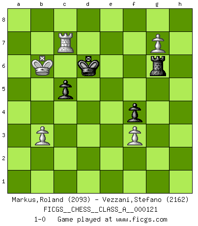 Last move : 1-0 2012 October 11 14:42:0 [Event "FICGS__CHESS__CLASS_A__000121"] [Site "FICGS"] [Date "2012.05.11"] [Round "1"] [White "Markus,Roland"] [Black "Vezzani,Stefano"] [Result "1-0"] [WhiteElo "2093"] [BlackElo "2162"] 1.e4 d5 2.exd5 Nf6 3.d4 Nxd5 4.c4 Nb6 5.Nf3 Bg4 6.c5 N6d7 7.Be2 e6 8.O-O Be7 9.Nc3 O-O 10.Qa4 Nc6 11.h3 Bh5 12.Bf4 Nf6 13.Rfe1 a6 14.Rad1 Qd7 15.g4 Bg6 16.Bc4 Rad8 17.d5 exd5 18.Nxd5 Nxd5 19.Rxd5 Qc8 20.Rxd8 Qxd8 21.Bxa6 Bxc5 22.Bxb7 Nb4 23.Bg3 Nd3 24.Re2 Bd6 25.Bxd6 Qxd6 26.Rd2 c5 27.Be4 Qf4 28.Rxd3 Qxe4 29.Qxe4 Bxe4 30.Rc3 Bxf3 31.Rxf3 h6 32.Kg2 Ra8 33.Ra3 Rc8 34.b3 Kf8 35.Ra4 Ke7 36.Kf3 Kd6 37.Ke3 Rc7 38.f3 Kd5 39.h4 Re7+ 40.Kd3 f5 41.g5 hxg5 42.hxg5 Rb7 43.Ra5 f4 44.Ra8 Re7 45.Rd8+ Kc6 46.Kc4 Re2 47.Rc8+ Kd6 48.a4 Rc2+ 49.Kd3 Rb2 50.Rb8 Kd5 51.a5 Ra2 52.Rd8+ Kc6 53.Rg8 Rxa5 54.Rxg7 Kd5 55.Rf7 Ke5 56.g6 Ra6 57.g7 Rg6 58.Kc4 Ke6 59.Ra7 Rg5 60.Kb5 Kd6 61.Kb6 Rg6 62.Rc7 1-0 Scandinavian : Marshall variation Kingside Castling by player White (move 8) Kingside Castling by player Black (move 9) 10 pieces endgame at move 53 : White KRPPP , Black KRPPP WHITE : King + 1 Rook 3 Pawns BLACK : King + 1 Rook 3 Pawns 9 pieces endgame at move 54 : White KRPPP , Black KRPP WHITE : King + 1 Rook 3 Pawns BLACK : King + 1 Rook 2 Pawns Player White won this chess game. Follow this game move after move (download)White lost because he failed to remember the right continuation and had to think up the moves himself. (Siegbert Tarrasch) Wer der Ansicht ist, daß alle Schachspieler verrückt sind, wird durch Studium des Lebens von Emil Josef Diemer nicht auf andere Gedanken kommen. (Hans Ree) El Ajedrez es parte de una cultura y si una cultura esta en decadencia, entonces también el Ajedrez declinará. (Mikhail Botvinnik) Les échecs sont un jeu terrible. Si vous n'avez pas le centre, votre adversaire a une position plus libre. Par contre, si vous avez le centre, alors vous avez vraiment quelque chose pour laquelle vous inquiéter ! (Siegbert Tarrasch) God is an atheist. (Unknown)
