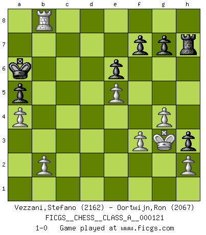 Last move : 1-0 2012 August 27 10:51:12 [Event "FICGS__CHESS__CLASS_A__000121"] [Site "FICGS"] [Date "2012.05.11"] [Round "1"] [White "Vezzani,Stefano"] [Black "Oortwijn,Ron"] [Result "1-0"] [WhiteElo "2162"] [BlackElo "2067"] 1.d4 e6 2.Nc3 d5 3.Bf4 Bd7 4.e3 Nf6 5.Nf3 a6 6.Bd3 c5 7.O-O Nc6 8.dxc5 Bxc5 9.e4 d4 10.Ne2 Nh5 11.e5 Nxf4 12.Nxf4 h5 13.Be4 Qc7 14.Qe2 h4 15.Nd3 Ba7 16.Rac1 h3 17.g3 Rd8 18.c4 dxc3 19.Rxc3 Qa5 20.Rfc1 Kf8 21.Ra3 Qc7 22.Nb4 Rh5 23.Rd3 a5 24.Nxc6 Bxc6 25.g4 Rh6 26.Rxd8+ Qxd8 27.Bxc6 bxc6 28.Qa6 Qb6 29.Qxb6 Bxb6 30.Rxc6 Bd8 31.Ne1 Ke8 32.Nd3 Kd7 33.Ra6 Bc7 34.f3 Rh8 35.Nc5+ Kc8 36.Ra8+ Bb8 37.Kf1 Rh6 38.Kf2 Kc7 39.Na6+ Kb6 40.Rxb8+ Kxa6 41.Kg3 Rh7 42.a4 1-0 Queen's pawn Kingside Castling by player White (move 7) Player White won this chess game. Follow this game move after move (download)Help your pieces so they can help you. (Paul Morphy) Schach ist das Spiel, das die Verrückten gesund hält. (Albert Einstein) Las Aperturas te enseñan aperturas. ¡Los Finales te enseñan Ajedrez!. (Stephan Gerzadowicz) Le plus grand jeu de l'esprit jamais inventé, plus vous l'apprenez, plus vous y prenez du plaisir. (Garry Kasparov) Games, world of games... There's always an opponent, and there's always a victim. (Revolver, movie)