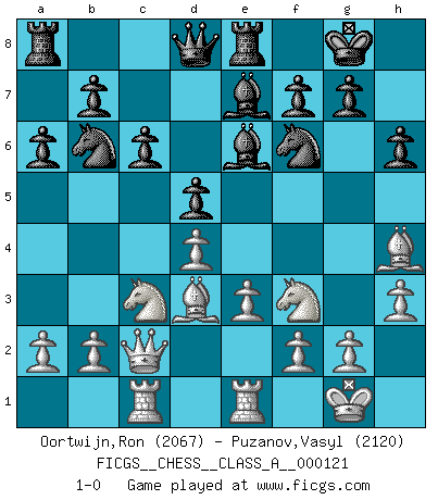 Last move : 1-0 2012 October 17 22:2:32 [Event "FICGS__CHESS__CLASS_A__000121"] [Site "FICGS"] [Date "2012.05.11"] [Round "1"] [White "Oortwijn,Ron"] [Black "Puzanov,Vasyl"] [Result "1-0"] [WhiteElo "2067"] [BlackElo "2120"] 1.d4 d5 2.c4 e6 3.Nc3 Nf6 4.Bg5 Be7 5.e3 c6 6.Nf3 Nbd7 7.Rc1 O-O 8.Bd3 h6 9.Bh4 a6 10.cxd5 exd5 11.O-O Re8 12.Qc2 Nb6 13.h3 Be6 14.Rfe1 1-0 This chess game has been lost on time (started : 2012.05.11 10:15:15) QGD : 4.Bg5 Be7 Kingside Castling by player Black (move 7) Kingside Castling by player White (move 11) Player White won this chess game. Follow this game move after move (download)A big shock; the best chess player in history has passed away. (Lajos Portisch, about Bobby Fischer's death) Ich organisiere ein großes Turnier, was mich etwa 120000 Dollar kostet. Ich denke, das ist das erste Mal in der Schachgeschichte, daß ein Schachgroßmeister auch als Mäzen auftritt. (Miguel Najdorf) La estratégia requiere pensar, la táctica requiere observación. (Max Euwe) J'ai toujours senti une vague pitié pour l'homme qui ne connaît rien aux échecs, tout comme j'en aurais pour un homme ignorant de l'amour. Les Echecs, comme la musique ou comme l'amour, ont le pouvoir de rendre heureux. (Siegbert Tarrasch) Chess, like love, like music, has the power to make people happy. (Siegbert Tarrasch)