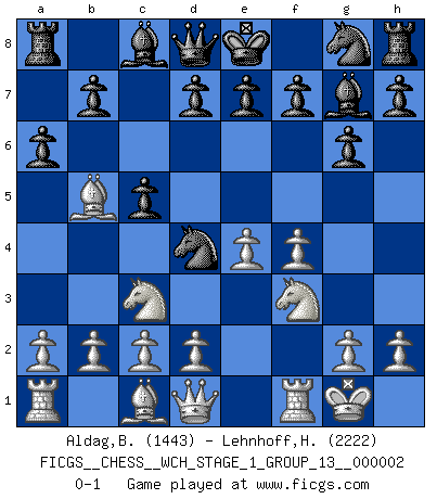 Last move : 0-1 2007 March 10 7:11:20 [Event "FICGS__CHESS__WCH_STAGE_1_GROUP_13__000002"] [Site "FICGS"] [Date "2007.01.16"] [Round "1"] [White "Aldag,Benjamin"] [Black "Lehnhoff,Heinz-Georg"] [Result "0-1"] [WhiteElo "1443"] [BlackElo "2222"] 1.e4 c5 2.Nc3 Nc6 3.f4 g6 4.Nf3 Bg7 5.Bb5 Nd4 6.O-O a6 0-1 This chess game has been lost on time (started : 2007.01.16 15:24:36) Sicilian : Grand Prix attack Kingside Castling by player White (move 6) Player Black won this chess game. Follow this game move after move (download)There must have been a time when men were demigods, or they could not have invented Chess. (Gustav Schenk) Der beste Spieler in einem Turnier gewinnt es nie. Er landet auf Platz zwei oder drei. (Siegbert Tarrasch) El Ajedrez, como cualquier actividad creativa, solo puede existir a través del esfuerzo combinado de aquellos que tienen talento creativo y de aquellos que poseen la habilidad de organizar su trabajo creativo. (Mikhail Botvinnik) Même si vous avez un bon coup à faire, regardez toujours s'il n'y en a pas un qui lui soit préférable. (Pedro Damiano) The best teachers teach from the heart, not from the book. (Author unknown)