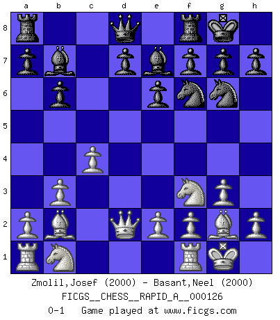 Last move : 0-1 2012 December 2 11:27:41 [Event "FICGS__CHESS__RAPID_A__000126"] [Site "FICGS"] [Date "2012.05.11"] [Round "1"] [White "Zmolil,Josef"] [Black "Basant,Neel"] [Result "0-1"] [WhiteElo "2000"] [BlackElo "2000"] 1.d4 Nf6 2.c4 e6 3.Nf3 b6 4.g3 Bb7 5.Bg2 c5 6.O-O cxd4 7.Qxd4 Nc6 8.Qf4 Ne7 9.b3 Ng6 10.Qd2 Be7 11.Bb2 O-O 0-1 This chess game has been lost on time (started : 2012.05.11 23:20:56) Queen's Indian : 4.g3 Bb7 Kingside Castling by player White (move 6) Kingside Castling by player Black (move 11) Player Black won this chess game. Follow this game move after move (download)Chess is in its essence a game, in its form an art, and in its execution a science. (Baron Tassilo) Jeder weiß, dass Gasprom Putins persönliches Machtinstrument ist. Die Firma wird vom Kreml aus geleitet und wird schon deshalb nie transparent sein. (Garry Kasparov) Mi estilo es algo parecido entre un poco de Tal y Petrosian. (Reshevsky) Je menace de comprendre la position. (Anonyme) You have to believe in yourself. (Sun Tzu)