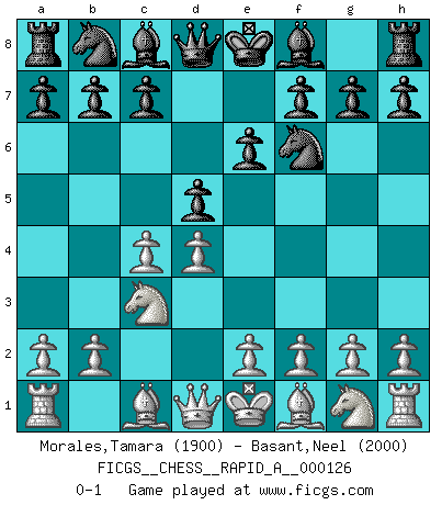 Last move : 0-1 2012 August 19 1:39:36 [Event "FICGS__CHESS__RAPID_A__000126"] [Site "FICGS"] [Date "2012.05.11"] [Round "1"] [White "Morales,Tamara"] [Black "Basant,Neel"] [Result "0-1"] [WhiteElo "1900"] [BlackElo "2000"] 1.d4 e6 2.c4 Nf6 3.Nc3 d5 0-1 This chess game has been lost on time (started : 2012.05.11 23:20:56) Queen's pawn Player Black won this chess game. Follow this game move after move (download)Chess holds its master in its own bonds, shackling the mind and brain so that the inner freedom of the very strongest must suffer. (Albert Einstein) Wie kann ich Remis annehmen? Ich weiß ja gar nicht, wie ich stehe! (Fritz Sämisch) Haz el enroque temprano y seguido. (Rob Sillars) Le joueur d'Echecs qui veut atteindre le top est obligé de développer son propre credo créatif. Alexeï Stepanovicth Souétine. Il est facile d'écrire des livres ! Ce qui est difficile, c'est de jouer ! (Alexeï Stepanovicth Souétine) The meaning of life is that it is to be lived, and it is not to be traded and conceptualized and squeezed into a pattern of systems. (Bruce Lee)