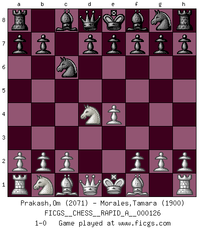 Last move : 1-0 2012 August 18 1:37:16 [Event "FICGS__CHESS__RAPID_A__000126"] [Site "FICGS"] [Date "2012.05.11"] [Round "1"] [White "Prakash,Om"] [Black "Morales,Tamara"] [Result "1-0"] [WhiteElo "2071"] [BlackElo "1900"] 1.e4 c5 2.Nf3 Nc6 3.d4 cxd4 4.Nxd4 1-0 This chess game has been lost on time (started : 2012.05.11 23:20:56) Sicilian defense Player White won this chess game. Follow this game move after move (download)Excellence at Chess is one mark of a scheming mind. (Sir Arthur Conan Doyle) Wenn ein Kopf und ein Buch zusammenstoßen und es klingt hohl, ist es denn allemal im Buche? (Georg Christoph Lichtenberg) El Ajedrez es el arte del análisis. (Mikhail Botvinnik) L'attaque fait le spectacle, la défense gagne les matchs. (Dicton footballistique) Lottery : A tax on people who are bad at math. (Author unknown)
