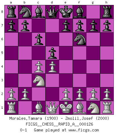 Last move : 0-1 2012 August 27 3:40:52 [Event "FICGS__CHESS__RAPID_A__000126"] [Site "FICGS"] [Date "2012.05.11"] [Round "1"] [White "Morales,Tamara"] [Black "Zmolil,Josef"] [Result "0-1"] [WhiteElo "1900"] [BlackElo "2000"] 1.d4 d5 2.c4 c6 3.Nc3 Nf6 0-1 This chess game has been lost on time (started : 2012.05.11 23:20:56) QGD Slav defense Player Black won this chess game. Follow this game move after move (download)Chess is a fighting game which is purely intellectual and includes chance. (Richard Reti) Im Leben werden Partien nie so unstrittig gewonnen wie im Spiel (Emanuel Lasker) No existe un remordimiento como el remordimiento del Ajedrez. (H. G. Wells) Le système Elo représente seulement une moyenne. Il est simplement un indicateur de votre stabilité. (Anatoli Karpov) Pretend inferiority and encourage his arrogance. (Sun Tzu)