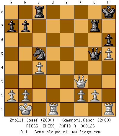 Last move : 0-1 2012 November 8 22:23:31 [Event "FICGS__CHESS__RAPID_A__000126"] [Site "FICGS"] [Date "2012.05.11"] [Round "1"] [White "Zmolil,Josef"] [Black "Komaromi,Gabor"] [Result "0-1"] [WhiteElo "2000"] [BlackElo "2000"] 1.e4 c6 2.d4 d5 3.Nc3 dxe4 4.Nxe4 Bf5 5.Ng3 Bg6 6.h4 h6 7.Nf3 Nd7 8.h5 Bh7 9.Bd3 Bxd3 10.Qxd3 e6 11.Bf4 Qa5+ 12.Bd2 Bb4 13.c3 Be7 14.c4 Qc7 15.O-O-O Ngf6 16.Kb1 O-O 17.Qe2 c5 18.Bc3 cxd4 19.Nxd4 Rfd8 20.Nxe6 fxe6 21.Qxe6+ Kf8 22.Nf5 Nc5 23.Nxg7 Kxg7 24.Qf5 Rg8 25.Bxf6+ Bxf6 26.Qg6+ Kh8 27.Qxf6+ Qg7 28.Qf5 Qg5 29.Qc2 Rad8 30.Qc3+ Rg7 31.Qf3 Rc8 0-1 This chess game has been lost on time (started : 2012.05.11 23:20:56) Caro-Kann : Classical, 7...Nd7 Queenside Castling by player White (move 15) Kingside Castling by player Black (move 16) Player Black won this chess game. Follow this game move after move (download)We don't really know how the game was invented, though there are suspicions. As soon as we discover the culprits, we'll let you know. (Bruce Pandolfini) Alle offensichtlichen Züge sehen nach dem Spiel in der Analyse verdächtig aus. (Viktor Kortschnoi) Existen dos clases de sacrificios: los correctos y los míos. (Mikhail Tal) Le temps de noter son nom sur la feuille de partie, j'étais déjà en zeitnot ! D'un modeste amateur apparié lors de la première ronde d'un open contre le grand-maître Azmaïparashvili. I don't diet. I just don't eat as much as I'd like to. (Linda Evangelista, supermodel)