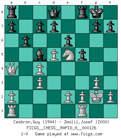 Last move : 1-0 2012 November 16 22:55:15 [Event "FICGS__CHESS__RAPID_A__000126"] [Site "FICGS"] [Date "2012.05.11"] [Round "1"] [White "Cesbron,Guy"] [Black "Zmolil,Josef"] [Result "1-0"] [WhiteElo "1944"] [BlackElo "2000"] 1.d4 f5 2.c4 Nf6 3.Nc3 e6 4.Nf3 Bb4 5.g3 Ne4 6.Qc2 b6 7.Bg2 Bb7 8.O-O Nxc3 9.bxc3 Be4 10.Qb3 Be7 11.d5 Na6 12.Be3 O-O 13.Qa4 Nc5 14.Bxc5 Bxc5 15.Ne5 Bxg2 16.Kxg2 1-0 This chess game has been lost on time (started : 2012.05.11 23:20:56) Dutch with c4 & Nc3 Kingside Castling by player White (move 8) Kingside Castling by player Black (move 12) Player White won this chess game. Follow this game move after move (download)Chess books should be used as we use glasses: to assist the sight, although some players make use of them as if they thought they conferred sight. (Jose Raul Capablanca) Wenn sie aufgeben, dann danke ich Ihnen für das Spiel (Eventualzug beim Fernschach). (Anonymous) La única cosa que los jugadores de Ajedrez tienen en común, es el Ajedrez. (Lodewijk Prins) C'est la seule position que je connaisse où les deux camps sont mals. Propos prêtés à V. Anand. Begin at the beginning and go on till you come to the end; then stop. (Lewis Carrol, Alice in Wonderland)