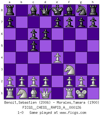 Last move : 1-0 2012 August 23 14:13:24 [Event "FICGS__CHESS__RAPID_A__000126"] [Site "FICGS"] [Date "2012.05.11"] [Round "1"] [White "Benoit,Sebastien"] [Black "Morales,Tamara"] [Result "1-0"] [WhiteElo "2006"] [BlackElo "1900"] 1.e4 c5 2.Nf3 Nc6 3.Bb5 d6 4.Bxc6+ bxc6 5.O-O 1-0 This chess game has been lost on time (started : 2012.05.11 23:20:56) Sicilian : Nimzovich-Rossolimo attack (without ...d6) Kingside Castling by player White (move 5) Player White won this chess game. Follow this game move after move (download)Chess, like any creative activity, can exist only through the combined efforts of those who have creative talent, and those who have the ability to organize their creative work. (Mikhail Botvinnik) Es genügt nicht ein guter Spieler zu sein, man muß auch gut spielen. (Siegbert Tarrasch) Un buen sacrificio es aquel que aunque no sea necesariamente sólido, deja a tu oponente aturdido y confuso. (Rudolph Spielmann) J'ai toujours senti une vague pitié pour l'homme qui ne connaît rien aux échecs, tout comme j'en aurais pour un homme ignorant de l'amour. Les Echecs, comme la musique ou comme l'amour, ont le pouvoir de rendre heureux. (Siegbert Tarrasch) Cactus - It is depressed cucumber. (Ilmars Cirulis)