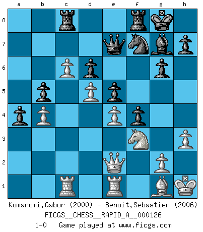 Last move : 1-0 2012 August 22 12:9:36 [Event "FICGS__CHESS__RAPID_A__000126"] [Site "FICGS"] [Date "2012.05.11"] [Round "1"] [White "Komaromi,Gabor"] [Black "Benoit,Sebastien"] [Result "1-0"] [WhiteElo "2000"] [BlackElo "2006"] 1.d4 Nf6 2.Bf4 g6 3.Nf3 Bg7 4.e3 O-O 5.Be2 d6 6.h3 c5 7.O-O cxd4 8.exd4 Qb6 9.Nbd2 Nc6 10.Nc4 Qc7 11.c3 Nd5 12.Bh2 b5 13.Ne3 Nxe3 14.fxe3 Rb8 15.Bd3 Bd7 16.Qd2 a6 17.Kh1 e5 18.Rac1 Rbd8 19.e4 f5 20.Rfe1 f4 21.Bg1 Rc8 22.b4 Qb7 23.a4 bxa4 24.d5 Nd8 25.c4 Nf7 26.c5 Bb5 27.c6 Qe7 28.Bxb5 axb5 29.Qe2 1-0 Queen's pawn game Kingside Castling by player Black (move 4) Kingside Castling by player White (move 7) Player White won this chess game. Follow this game move after move (download)I feel as if I were a piece in a game of Chess, when my opponent says of it: That piece cannot be moved. (Soren Kierkegaard) Viele Opfer benötigen überhaupt keine konkrete Berechnung. Es genügt sich die entstehende Position kurz vorzustellen, um uns davon zu überzeugen, dass das Opfer korrekt ist. (Mikhail Nekhemyevich Tal) El Ajedrez es un mar en el cual un mosquito puede beber y un elefante puede bañarse. (Refrán Hindú) À la honte des hommes, on sait que les lois du jeu sont les seules qui soient partout justes, claires, inviolables et exécutées. Pourquoi l'Indien qui a donné les règles du jeu d'échecs est-il obéi de bon gré dans toute la terre, et que les décrétales des papes, par exemple, sont aujourd'hui un objet d'horreur et de mépris ? C'est que l'inventeur des échecs combina tout avec justesse pour la satisfaction des joueurs, et que les papes, dans leurs décrétales, n'eurent en vue que leur seul avantage. L'Indien voulut exercer également l'esprit des hommes et leur donner du plaisir; les papes ont voulu abrutir l'esprit des hommes. Voltaire (Dictionnaire philosophique / Garnier 1967) The age of a woman doesn't mean a thing. The best tunes are played on the oldest fiddles. (Ralph Waldo Emerson)