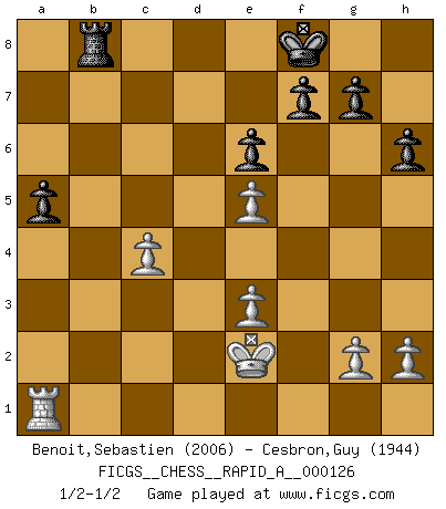 Last move : 1/2-1/2 2012 October 10 0:13:59 [Event "FICGS__CHESS__RAPID_A__000126"] [Site "FICGS"] [Date "2012.05.11"] [Round "1"] [White "Benoit,Sebastien"] [Black "Cesbron,Guy"] [Result "1/2-1/2"] [WhiteElo "2006"] [BlackElo "1944"] 1.e4 e6 2.d4 d5 3.Nd2 Nc6 4.Ngf3 Nf6 5.e5 Nd7 6.Nb3 a5 7.a4 Be7 8.Bb5 Na7 9.Bd3 b6 10.O-O Bb7 11.Be3 c5 12.c4 O-O 13.Rc1 cxd4 14.Nbxd4 Nc5 15.cxd5 Qxd5 16.Bc4 Qe4 17.Nb3 Rfd8 18.Nxc5 Bxc5 19.Qb3 Bxe3 20.Qxe3 Qxe3 21.fxe3 h6 22.Rfd1 Be4 23.Nd4 Nc6 24.Nxc6 Bxc6 25.b3 Rxd1+ 26.Rxd1 Rb8 27.Kf2 b5 28.axb5 Bxb5 29.Ke2 Bxc4+ 30.bxc4 Kf8 31.Ra1 1/2-1/2 French : Tarrasch, Guimard Main line Kingside Castling by player White (move 10) Kingside Castling by player Black (move 12) This chess game ended in a draw. Follow this game move after move (download)You sit at the board and suddenly your heart leaps. Your hand trembles to pick up the piece and move it. But what Chess teaches you is that you must sit there calmly and think about whether it's really a good idea and whether there are other better ideas. (Stanley Kubrick) Karpov ist ein Museumsstück. (Garry Kasparov) Solo el jugador con la iniciativa tiene el derecho a atacar. (Wilhelm Steinitz) Les sacrifices démontrent seulement que quelqu'un a gaffé. (Savielly Tartacover) Fame, I have already. Now I need the money. (an elderly Steinitz)