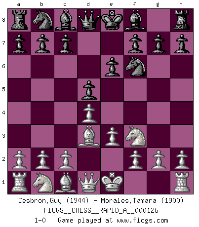 Last move : 1-0 2012 August 21 13:48:40 [Event "FICGS__CHESS__RAPID_A__000126"] [Site "FICGS"] [Date "2012.05.11"] [Round "1"] [White "Cesbron,Guy"] [Black "Morales,Tamara"] [Result "1-0"] [WhiteElo "1944"] [BlackElo "1900"] 1.d4 d5 2.Nf3 Nf6 3.e3 e6 4.Bd3 1-0 This chess game has been lost on time (started : 2012.05.11 23:20:56) Queen's pawn game Player White won this chess game. Follow this game move after move (download)Chess is a sea in which a gnat may drink and an elephant may bathe. (Hindu proverb) Wenn es im Universum noch irgendwo intelligente Lebewesen gibt, dann kennen sie Go. (Emanuel Lasker) Aunque la mayoría de la gente disfruta observar las partidas de los grandes Maestros de ataque, algunos de los jugadores mas notables en la historia han sido los jugadores silenciosos posicionales. Lentamente ellos te aplastan despojandote de tu espacio, congestionando tus piezas y dejandote virtualmente sin nada que hacer. (Yasser Seirawan) Il n'y a plus de joueurs du niveau de Jacob Murray dont la seule quête est le beau jeu, le plaisir de voir les pièces construire quelque chose. Sur 10 idées à la minute, 9 seront sans intérêt, la dernière s'avèrera géniale. (Christian Bauer) A generalist learns less and less about more and more until he knows nothing about everything. (Author unknown)