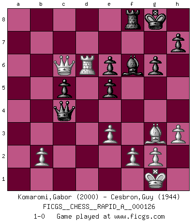 Last move : 1-0 2012 September 22 12:47:34 [Event "FICGS__CHESS__RAPID_A__000126"] [Site "FICGS"] [Date "2012.05.11"] [Round "1"] [White "Komaromi,Gabor"] [Black "Cesbron,Guy"] [Result "1-0"] [WhiteElo "2000"] [BlackElo "1944"] 1.d4 Nf6 2.Bf4 g6 3.Nf3 Bg7 4.e3 O-O 5.Be2 c5 6.c3 d6 7.O-O b6 8.h3 Bb7 9.Nbd2 Nbd7 10.a4 a6 11.Qb3 Qc7 12.Bh2 Bd5 13.c4 Bb7 14.d5 e6 15.dxe6 fxe6 16.Qd3 Ne5 17.Nxe5 dxe5 18.Bf3 Rad8 19.Qc2 Ne8 20.a5 Nd6 21.Bxb7 Qxb7 22.axb6 Qxb6 23.Bg3 Rb8 24.Ne4 Nf5 25.Qa4 a5 26.Bh2 Nd6 27.Nxd6 Qxd6 28.Rfd1 Qa6 29.Qxa5 Qxc4 30.Qc7 Rbc8 31.Qb7 Rb8 32.Qc7 Rbc8 33.Qd7 Ra8 34.Rxa8 Rxa8 35.Bg3 Bf6 36.Qc6 Rf8 37.Rd6 1-0 Queen's pawn game Kingside Castling by player Black (move 4) Kingside Castling by player White (move 7) Player White won this chess game. Follow this game move after move (download)The older I grow, the more I value pawns. (Paul Keres) Auf jeden Fall musst du zuerst Rechtsanwalt werden, damit du deine eigenen Interessen und die deiner Familie vertreten kannst. [Brief an seinen Sohn] (José Raúl Capablanca) Si no le temes a Spassky, entonces elimino el elemento del dinero. (Jim Slater) Karpov est une pièce de musée. (Garry Kasparov) Now be brave and don't look back. Don't look back. (Shmi Skywalker in Star Wars ep.1)