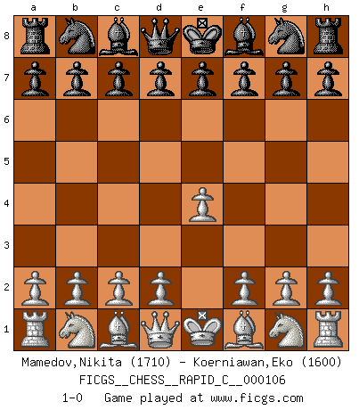 Last move : 1-0 2012 August 15 13:22:43 [Event "FICGS__CHESS__RAPID_C__000106"] [Site "FICGS"] [Date "2012.05.14"] [Round "1"] [White "Mamedov,Nikita"] [Black "Koerniawan,Eko"] [Result "1-0"] [WhiteElo "1710"] [BlackElo "1600"] 1.e4 1-0 This chess game has been lost on time (started : 2012.05.14 13:14:29) King's pawn Opening Player White won this chess game. Follow this game move after move (download)It was clear to me that the vulnerable point of the American Grandmaster (Bobby Fischer) was in double-edged, hanging, irrational positions, where he often failed to find a win even in a won position. (Efim Geller) Kritik überlasse ich den Spießern. Ich zeige nichts, wofür ich mich schämen muss. (Alexandra Kosteniuk) El Peón aislado arroja penumbra sobre todo el tablero. (Aaron Nimzovich) Les écrivains ont utilisé les échecs pour analyser les côtés extrêmes de la nature humaine. Dans ce cadre, les échecs offrent un champ d'expérimentation idéal. Mais on pourrait faire la même chose avec la peinture. Et là, en vous référant à Van Gogh, vous ne tirerez pas de conclusion définitive sur les peintres. (Gary Kasparov) Life is like a ten-speed bicycle: most of us have gears we never use. (Charles M. Schulz)