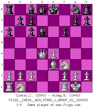 Last move : 1-0 2007 March 10 19:13:13 [Event "FICGS__CHESS__WCH_STAGE_1_GROUP_13__000002"] [Site "FICGS"] [Date "2007.01.16"] [Round "1"] [White "Czekaj,Christophe"] [Black "Aldag,Benjamin"] [Result "1-0"] [WhiteElo "2000"] [BlackElo "1443"] 1.e4 e5 2.Nf3 Nc6 3.Bb5 a6 4.Bxc6 dxc6 5.O-O Bd6 6.d4 exd4 7.Qxd4 f6 8.Be3 1-0 This chess game has been lost on time (started : 2007.01.16 15:24:36) Ruy Lopez : Exchange variation, 5.O-O Kingside Castling by player White (move 5) Player White won this chess game. Follow this game move after move (download)Alekhine is a poet who creates a work of art out of something that would hardly inspire another man to send home a picture post card. (Max Euwe) Wenn ich mich einlogge, glauben die Leute gewöhnlich nicht, dass ich es selbst bin und sie fangen an, mir dumme Fragen zu stellen. Und wenn sie es glauben, stellen sie wieder andere dumme Fragen. (Judith Polgar) Si el ingenio solamente fuese necesario para lucirse, las mujeres serían las mejores jugadoras de Ajedrez del mundo. (Albin) Seul un grand joueur sait à quel point il joue faiblement. (Xavier Tartacover) Two beer, or not two beer. (Unknown)