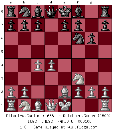 Last move : 1-0 2012 September 8 5:31:22 [Event "FICGS__CHESS__RAPID_C__000106"] [Site "FICGS"] [Date "2012.05.14"] [Round "1"] [White "Oliveira,Carlos"] [Black "Guichsen,Goran"] [Result "1-0"] [WhiteElo "1636"] [BlackElo "1600"] 1.e4 d5 2.exd5 Qxd5 3.d4 Nf6 4.Nf3 g6 5.c4 Qd8 6.Be2 1-0 This chess game has been lost on time (started : 2012.05.14 13:14:29) Scandinavian (centre counter) defense Player White won this chess game. Follow this game move after move (download)At this time Fischer is simply a level above all the best Chessplayers in the world. (John Jacobs) Dass jemand wie Surab Asmaiparaschwili, der selbst Elopunkte gekauft hat , Vize-Präsident der Fide werden konnte, sagt schon einges über den Zustand dieser Organisation aus. (Joel Lautier) Una de estas pequeñas movidas modestas pudieran ser mas molestas a tu oponente que la amenaza mas grande. (Siegbert Tarrasch) L'ordinateur a tué l'originalité. Il n'y a plus guère d'aventures sur l'échiquier. (Jacob Murray) If everyone is thinking alike, then somebody isn't thinking. (US General George S. Patton)