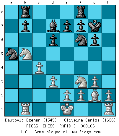Last move : 1-0 2012 October 18 22:3:47 [Event "FICGS__CHESS__RAPID_C__000106"] [Site "FICGS"] [Date "2012.05.14"] [Round "1"] [White "Dautovic,Dzenan"] [Black "Oliveira,Carlos"] [Result "1-0"] [WhiteElo "1545"] [BlackElo "1636"] 1.c4 Nf6 2.g3 g6 3.Bg2 Bg7 4.Nc3 O-O 5.d3 c5 6.Bg5 Nc6 7.Qd2 d6 8.Rb1 a6 9.a3 Bd7 10.b4 cxb4 11.axb4 Rb8 12.b5 axb5 13.Nxb5 h6 14.Bxh6 Qa5 15.Qxa5 Nxa5 16.Bxg7 Kxg7 17.Nf3 1-0 This chess game has been lost on time (started : 2012.05.14 13:14:29) English, 1...Nf6 (Anglo-Indian defense) Kingside Castling by player Black (move 4) Player White won this chess game. Follow this game move after move (download)A sacrifice is best refuted by accepting it. (Wilhelm Steinitz) Kasparov stellt für gewöhnlich die Regeln auf und bricht sie dann selbst wieder. (Alexej Shirov) Prefiero perder una partida realmente buena, que ganar una mala. (David Levy) Il vaut toujours mieux jouer un plan faux de façon logique que de n'avoir pas de plan du tout. (Victor Kortchnoï) Humor is by far the most significant activity of the human brain. (Edward De Bono)