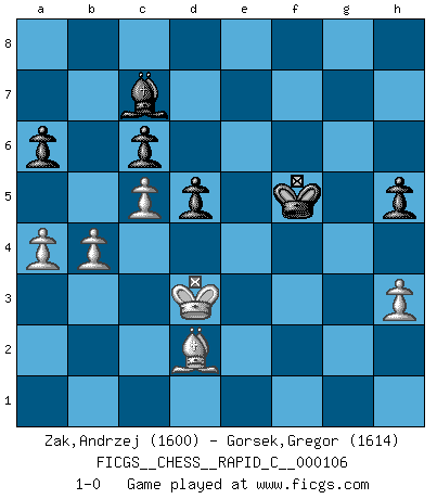 Last move : 1-0 2012 October 1 21:13:52 [Event "FICGS__CHESS__RAPID_C__000106"] [Site "FICGS"] [Date "2012.05.14"] [Round "1"] [White "Zak,Andrzej"] [Black "Gorsek,Gregor"] [Result "1-0"] [WhiteElo "1600"] [BlackElo "1614"] 1.d4 g6 2.c4 Bg7 3.Nf3 d6 4.Nc3 Bg4 5.e3 Nc6 6.Be2 e5 7.d5 Bxf3 8.Bxf3 Nce7 9.e4 f5 10.O-O Nf6 11.Qa4+ Qd7 12.Qxd7+ Kxd7 13.g3 Rhf8 14.Bd2 fxe4 15.Nxe4 Nxe4 16.Bxe4 Nf5 17.Rfe1 Rf7 18.Rac1 Raf8 19.b3 Nd4 20.Be3 c5 21.dxc6+ bxc6 22.f4 exf4 23.Bxf4 Re8 24.Re3 Rfe7 25.Rce1 Rxe4 26.Rxe4 Nf3+ 27.Kf2 Nxe1 28.Rxe1 Bd4+ 29.Kf1 Rxe1+ 30.Kxe1 Ke6 31.g4 h5 32.gxh5 gxh5 33.Ke2 a6 34.Kd3 Bc5 35.Bd2 Kf5 36.h3 Bf2 37.Ke2 Bd4 38.Kd3 Bb6 39.b4 Ke5 40.a4 d5 41.c5 Bc7 42.Ke3 Kf5 43.Kd3 1-0 Modern defense Kingside Castling by player White (move 10) Player White won this chess game. Follow this game move after move (download)Of Chess it has been said that life is not long enough for it, but that is the fault of life, not Chess. (William Ewart Napier) Ich kenne Menschen, die allen Willen der Welt besitzen und doch nicht Schach spielen können. (Robert James Fischer) Mis oponentes también hacen buenas movidas. A veces yo no tomo esas cosas en consideración. (Bobby Fischer) Comme les marins qui ont mille raisons différentes d'aller en mer, les joueurs d'échecs en ont tout autant avant de s'installer devant une table et jouer... (Vincent Bertignac, philosophe) Everybody lies. (Gregory House, House M.D.)