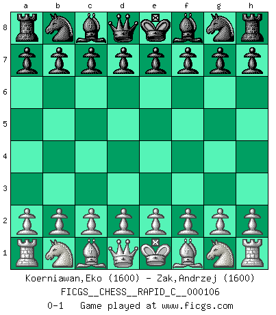 Last move : 0-1 2012 August 15 1:20:39 [Event "FICGS__CHESS__RAPID_C__000106"] [Site "FICGS"] [Date "2012.05.14"] [Round "1"] [White "Koerniawan,Eko"] [Black "Zak,Andrzej"] [Result "0-1"] [WhiteElo "1600"] [BlackElo "1600"] 0-1 This chess game has been lost on time (started : 2012.05.14 13:14:29) Player Black won this chess game. Follow this game move after move (download)I like the moment when I break a man's ego. (Bobby Fischer) Ich würde mich als ganz normalen Jungen bezeichnen [Im Alter von 12]. (Sergej Karjakin) El pensamiento metódico es mas útil en el Ajedrez que la inspiración. (C. J. S. Purdy) La vie est comme un jeu d'échecs : nous esquissons un plan, mais celui-ci est tributaire de ce que daignent faire l'adversaire aux échecs et le destin dans la vie. (Arthur Schopenhauer) All battles are fought by scared men who'd rather be someplace else. (John Wayne in the movie In harm's way)