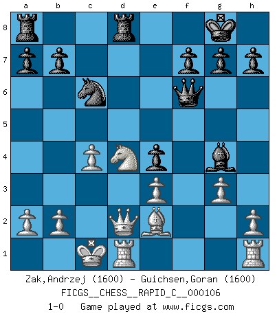Last move : 1-0 2012 September 18 7:32:17 [Event "FICGS__CHESS__RAPID_C__000106"] [Site "FICGS"] [Date "2012.05.14"] [Round "1"] [White "Zak,Andrzej"] [Black "Guichsen,Goran"] [Result "1-0"] [WhiteElo "1600"] [BlackElo "1600"] 1.d4 d5 2.c4 e6 3.Nf3 c5 4.Nc3 cxd4 5.Nxd4 Nf6 6.Bg5 e5 7.Nf3 d4 8.Nd5 Be7 9.Bxf6 Bxf6 10.e4 dxe3 11.fxe3 e4 12.Nxf6+ Qxf6 13.Nd4 Nc6 14.Qd2 O-O 15.O-O-O Rd8 16.g3 Bg4 17.Be2 1-0 This chess game has been lost on time (started : 2012.05.14 13:14:29) Queen's gambit declined Kingside Castling by player Black (move 14) Queenside Castling by player White (move 15) Player White won this chess game. Follow this game move after move (download)Suddenly it was obvious to me in my analysis I had missed what Fischer had found with the greatest of ease at the board. (Mikhail Botvinnik) Kleine Schachspieler machen Mist, und große Schachspieler machen Mist, aber große machen weniger Mist. (Fritz Sämisch) Una clavada es mas poderosa que una espada. (Fred Reinfeld) Vous n'êtes pas toujours obligé de jouer le meilleur coup. Un coup doit être actif, entreprenant, correct et beau ! (David Bronstein) The right perception of any matter and a misunderstanding of the same matter do not wholly exclude each other. (Kafka's the trial)