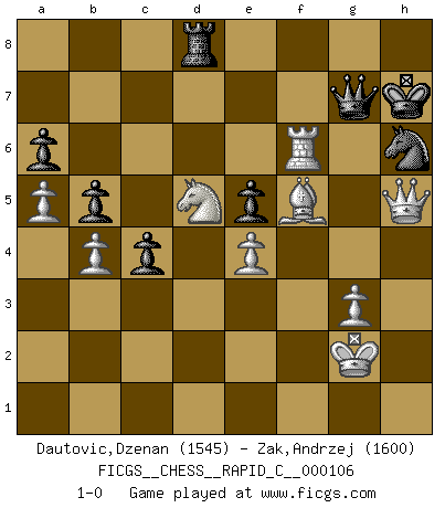 Last move : 1-0 2012 October 9 7:35:29 [Event "FICGS__CHESS__RAPID_C__000106"] [Site "FICGS"] [Date "2012.05.14"] [Round "1"] [White "Dautovic,Dzenan"] [Black "Zak,Andrzej"] [Result "1-0"] [WhiteElo "1545"] [BlackElo "1600"] 1.c4 Nf6 2.g3 d5 3.cxd5 Nxd5 4.Bg2 Nc6 5.Nc3 e6 6.Nf3 g6 7.O-O Bg7 8.d4 O-O 9.a3 Na5 10.e4 Nb6 11.Bg5 f6 12.Bf4 Nac4 13.b3 Nd6 14.h4 Qe7 15.Qc2 e5 16.dxe5 fxe5 17.Bg5 Qe8 18.a4 Bg4 19.Nh2 Be6 20.a5 Nd7 21.Be3 a6 22.Rab1 Rc8 23.Nf3 b6 24.Ng5 b5 25.Nxe6 Qxe6 26.Nd5 c5 27.Kh2 Nf6 28.Bh3 Ng4+ 29.Kg2 h5 30.Bg5 Rce8 31.f3 c4 32.b4 Qd7 33.Rbd1 Kh8 34.Qe2 Rf7 35.fxg4 Rxf1 36.Rxf1 hxg4 37.Bxg4 Qb7 38.Bf6 Nf7 39.Qf2 Nh6 40.Bxg7+ Qxg7 41.Bh3 Ng8 42.Qf7 Rd8 43.h5 gxh5 44.Qxh5+ Nh6 45.Rf6 Kh7 46.Bf5+ 1-0 English, 1...Nf6 (Anglo-Indian defense) Kingside Castling by player White (move 7) Kingside Castling by player Black (move 8) Player White won this chess game. Follow this game move after move (download)We must make sure that Chess will not be like a dead language, very interesting, but for a very small group. (Sytze Faber) Frage: Gibt es etwas was Sie mehr lieben als Autobahnen ohne Tempobegrenzungen? - Antwort: Deutsche Frauen ohne Tempobegrenzungen. (Loek van Wely) Después de una mala apertura, hay una esperanza en el juego medio. Pero una vez que estas en finales, el momento de la verdad ha llegado. (Edmar Mednis) Les erreurs sont comme les malheurs, elles n'arrivent jamais seules. (Siegbert Tarrasch) Don't anthropomorphize computers - they hate it. (Anonymous)