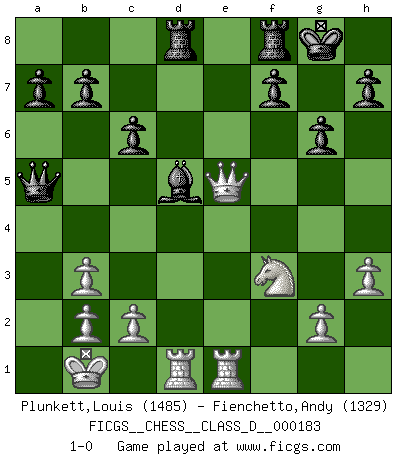 Last move : 1-0 2012 October 4 21:17:41 [Event "FICGS__CHESS__CLASS_D__000183"] [Site "FICGS"] [Date "2012.05.14"] [Round "1"] [White "Plunkett,Louis"] [Black "Fienchetto,Andy"] [Result "1-0"] [WhiteElo "1485"] [BlackElo "1329"] 1.d4 d5 2.e4 dxe4 3.f3 exf3 4.Qxf3 Nf6 5.Bd3 Qxd4 6.Nc3 c6 7.Be3 Qe5 8.h3 Nbd7 9.O-O-O g6 10.Bf4 Qa5 11.Bc4 Bg7 12.Qe3 e6 13.Bxe6 O-O 14.Bb3 Nc5 15.Kb1 Nxb3 16.axb3 Be6 17.Bh6 Rad8 18.Nf3 Nd5 19.Nxd5 Bxd5 20.Bxg7 Kxg7 21.Qe5+ Kg8 22.Rhe1 1-0 Blackmar gambit Queenside Castling by player White (move 9) Kingside Castling by player Black (move 13) Player White won this chess game. Follow this game move after move (download)There just isn't enough televised Chess. (David Letterman) Der 70jährige Viktor Kortschnoi: Die Rentenanstalt wollte mich zwingen in Rente zu gehen. Meine Frau erhält jetzt eine Pension- und ich zahle weiter in die Rentenkasse ein! (Viktor Kortschnoi) Un sacrificio se refuta mucho mejor al aceptarlo. (Wilhelm Steinitz) Les écrivains ont utilisé les échecs pour analyser les côtés extrêmes de la nature humaine. Dans ce cadre, les échecs offrent un champ d'expérimentation idéal. Mais on pourrait faire la même chose avec la peinture. Et là, en vous référant à Van Gogh, vous ne tirerez pas de conclusion définitive sur les peintres. (Gary Kasparov) As the days dwindle down... to a precious few. (Maxwell Anderson)