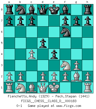 Last move : 0-1 2012 October 12 9:50:27 [Event "FICGS__CHESS__CLASS_D__000183"] [Site "FICGS"] [Date "2012.05.14"] [Round "1"] [White "Fienchetto,Andy"] [Black "Pech,Stepan"] [Result "0-1"] [WhiteElo "1329"] [BlackElo "1441"] 1.c4 e5 2.g3 Nf6 3.Bg2 d5 4.Nf3 e4 0-1 This chess game has been lost on time (started : 2012.05.14 23:47:0) English Opening Player Black won this chess game. Follow this game move after move (download)You must take your opponent into a deep dark forest where 2+2=5, and the path leading out is only wide enough for one. (Mikhail Tal) Auf Remis zu spielen ist gewissermaßen ein Verbrechen gegen das Schachspiel. (Mikhail Nekhemyevich Tal) a manera como él juega al Ajedrez, demuestra la completa naturaleza de un hombre. (Stanley Ellin) Il n'y a pas de prix trop élevé au scalp de l'ennemi. (Koblentz) Internet: Absolute communication, absolute isolation. (Paul Carvel)