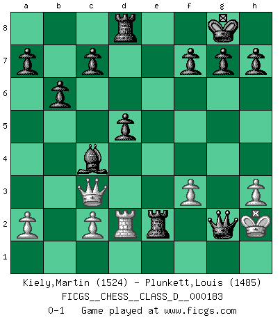 Last move : 0-1 2012 October 18 18:34:21 [Event "FICGS__CHESS__CLASS_D__000183"] [Site "FICGS"] [Date "2012.05.14"] [Round "1"] [White "Kiely,Martin"] [Black "Plunkett,Louis"] [Result "0-1"] [WhiteElo "1524"] [BlackElo "1485"] 1.d4 b6 2.e4 e6 3.Nc3 Bb7 4.Nf3 Bb4 5.Bd2 Bxc3 6.Bxc3 Bxe4 7.Bd3 Bb7 8.O-O Nf6 9.Ne5 O-O 10.f3 d6 11.Nc4 Nbd7 12.Re1 Nd5 13.Be4 N7f6 14.Bxd5 Bxd5 15.Ne3 Bb7 16.b3 Qe8 17.Qd3 Qc6 18.Nc4 Rae8 19.Re3 Rd8 20.Rf1 Nd5 21.R3e1 Nxc3 22.Qxc3 d5 23.Qd3 dxc4 24.bxc4 Ba6 25.Rd1 Bxc4 26.d5 exd5 27.Qc3 Qc5+ 28.Rf2 Rfe8 29.h3 Re2 30.Rd2 Qxf2+ 31.Kh2 Qxg2+ 0-1 Queen's pawn : English defense Kingside Castling by player White (move 8) Kingside Castling by player Black (move 9) Player Black won this chess game. Follow this game move after move (download)Do you realize Fischer almost never has any bad pieces? He exchanges them, and the bad pieces remain with his opponents. (Yuri Balashov) Ich erzeugte keinen Neid, da mich die Schachspieler als Musiker und die Musiker als Schachspieler betrachteten. (Mark Taimanov) Realmente no sabemos como el juego fue inventado, aunque hay sospechas. Tan pronto como descubramos a los culpables, se los haremos saber. (Bruce Pandolfini) Les Echecs ont trois composantes : le temps, l'espace et le matériel en dernier. (Mikhail Tal) Now be brave and don't look back. Don't look back. (Shmi Skywalker in Star Wars ep.1)