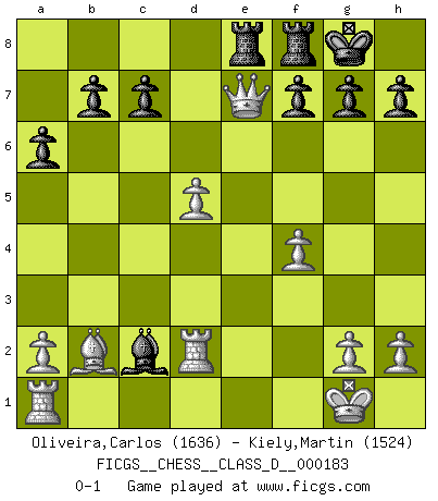 Last move : 0-1 2012 November 20 22:50:49 [Event "FICGS__CHESS__CLASS_D__000183"] [Site "FICGS"] [Date "2012.05.14"] [Round "1"] [White "Oliveira,Carlos"] [Black "Kiely,Martin"] [Result "0-1"] [WhiteElo "1636"] [BlackElo "1524"] 1.e4 e5 2.Nf3 Nc6 3.Bb5 a6 4.Bxc6 dxc6 5.O-O Nf6 6.Nxe5 Nxe4 7.Qe2 Bf5 8.d3 Qe7 9.dxe4 Qxe5 10.Nc3 Be6 11.f4 Qd4+ 12.Be3 Qb4 13.Rfd1 Qxb2 14.Nd5 cxd5 15.exd5 Bf5 16.Bd4 Be7 17.Bxb2 O-O 18.Qxe7 Bxc2 19.Rd2 Rae8 0-1 This chess game has been lost on time (started : 2012.05.14 23:47:0) Ruy Lopez : Exchange variation, 5.O-O Kingside Castling by player White (move 5) Kingside Castling by player Black (move 17) Player Black won this chess game. Follow this game move after move (download)Pawn endings are to Chess what putting is to golf. (Cecil Purdy) Über Frauen: Chess is better. (Robert James Fischer) De todos mis libros Rusos, la defensa contiene y difunde el 'calor' mas grande que pudiese verse extraño al observar lo supremamente abstracto que el Ajedrez supuestamente es. (Vladimir Nabokov) Un footballeur joue avec ses pieds, parfois avec sa tête. Un joueur d'échecs ne joue qu'avec sa tête. Et quand il ne joue plus, il meurt. (Jacob Murray) Do you know these so called Volunteers don't even get paid! (Simpsons)