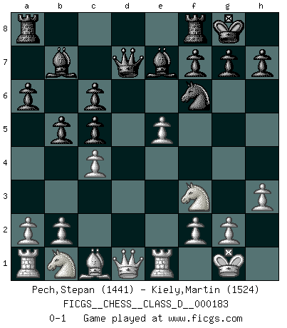 Last move : 0-1 2012 November 19 10:53:26 [Event "FICGS__CHESS__CLASS_D__000183"] [Site "FICGS"] [Date "2012.05.14"] [Round "1"] [White "Pech,Stepan"] [Black "Kiely,Martin"] [Result "0-1"] [WhiteElo "1441"] [BlackElo "1524"] 1.e4 e5 2.Nf3 Nc6 3.Bb5 a6 4.Ba4 Nf6 5.O-O Be7 6.Re1 O-O 7.Bxc6 dxc6 8.Nxe5 Qd4 9.Nf3 Qd7 10.d4 b5 11.h3 Bb7 12.c4 c5 13.d5 c6 14.d6 Bxd6 15.e5 Be7 0-1 This chess game has been lost on time (started : 2012.05.14 23:47:0) Ruy Lopez : Closed defense Kingside Castling by player White (move 5) Kingside Castling by player Black (move 6) Player Black won this chess game. Follow this game move after move (download)Chess books should be used as we use glasses: to assist the sight, although some players make use of them as if they thought they conferred sight. (Jose Raul Capablanca) Wie bekannt hörte Morphy 1859 auf, Schach zu spielen. Seine Enttäuschung galt nicht so sehr dem Schach, wie den Schachspielern. (Robert James Fischer) El Ajedrez no es como la vida... ¡tiene reglas!. (Mark Pasternak) Les échecs sont plus proches de l'art de l'assassinat que de l'art de la guerre. (Arturo Perez-Reverte) Whoever said the pen is mightier than the sword obviously never encountered automatic weapons. (US General Douglas MacArthur)