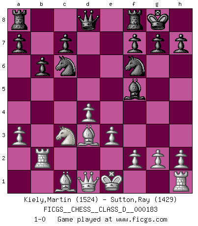 Last move : 1-0 2012 August 12 19:27:23 [Event "FICGS__CHESS__CLASS_D__000183"] [Site "FICGS"] [Date "2012.05.14"] [Round "1"] [White "Kiely,Martin"] [Black "Sutton,Ray"] [Result "1-0"] [WhiteElo "1524"] [BlackElo "1429"] 1.d4 Nf6 2.c4 e6 3.Nc3 Bb4 4.e3 d5 5.a3 Bxc3+ 6.bxc3 O-O 7.cxd5 exd5 8.c4 Be6 9.Rb1 b6 10.cxd5 Bxd5 11.Ne2 Be4 12.Rb2 Nc6 13.Nc3 Bf5 14.Bd3 1-0 Nimzo-Indian : 4.e3 Kingside Castling by player Black (move 6) Player White won this chess game. Follow this game move after move (download)There are tough players and nice guys, and I'm a tough player. (Bobby Fischer) Das typische an einem Großmeister ist, daß er eine gewonnene Position schnell und schmerzlos gewinnt. (Irving Chernev) Los Peones son nacidos libres, y aún así, se encuentran encadenados por todos lados. (Rick Kennedy) On entre au jeu d'Echecs comme on entre en Religion. Pour le joueur d'Echecs, la partie d'Echecs c'est l'office, la messe, le défilé du 1er Mai, le dépôt de gerbe au Monument aux Morts. C'est un drame sacré. (Michel Roos) To err is human, to shift the blame on someone else is tactical. (Mladen Jankovic)