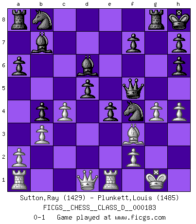 Last move : 0-1 2012 August 6 0:23:53 [Event "FICGS__CHESS__CLASS_D__000183"] [Site "FICGS"] [Date "2012.05.14"] [Round "1"] [White "Sutton,Ray"] [Black "Plunkett,Louis"] [Result "0-1"] [WhiteElo "1429"] [BlackElo "1485"] 1.e4 c5 2.Nf3 e6 3.d4 cxd4 4.Nxd4 a6 5.Nc3 b5 6.Be2 Bb7 7.O-O b4 8.Nb1 Bxe4 9.Nd2 Bb7 10.Bf3 d5 11.c4 Nf6 12.Re1 Qc8 13.b3 Be7 14.Qc2 O-O 15.Nf1 Bd6 16.Bh6 gxh6 17.g4 Kh8 18.Ng3 Rg8 19.Nh5 Nxh5 20.Qd2 Nf4 21.h4 e5 22.Nf5 Qxf5 23.Qd1 e4 0-1 Sicilian : Kan, 5.Nc3 Kingside Castling by player White (move 7) Kingside Castling by player Black (move 14) Player Black won this chess game. Follow this game move after move (download)Without error there can be no brilliancy. (Emanuel Lasker) Ich hatte Angst gegen einen russischen Großmeister zu verlieren, und er befürchtete gegen einen kleinen Jungen zu verlieren. (über ein Remis gegen Juri Awerbach). (Robert James Fischer) El Ajedrez es realmente noventa y nueve por ciento calculación. (Soltis) Des combinaisons [dans le jeu d'échecs] pareilles à des mélodies. Je crois entendre pour ainsi dire la musique des coups... (Vladimir Nabokov) It's not enough to succeed. Others must fail. (Gore Vidal)