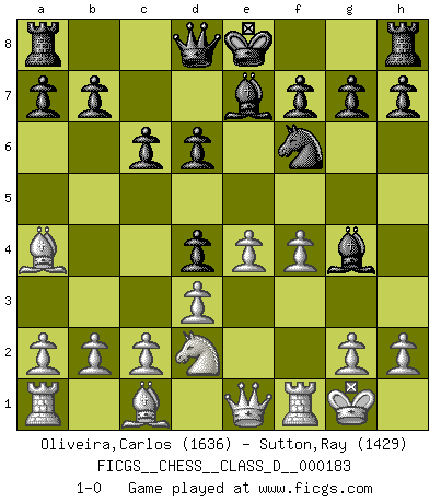 Last move : 1-0 2012 August 16 22:23:40 [Event "FICGS__CHESS__CLASS_D__000183"] [Site "FICGS"] [Date "2012.05.14"] [Round "1"] [White "Oliveira,Carlos"] [Black "Sutton,Ray"] [Result "1-0"] [WhiteElo "1636"] [BlackElo "1429"] 1.e4 e5 2.Nf3 Nc6 3.Bb5 Nd4 4.Nxd4 exd4 5.O-O c6 6.Ba4 Nf6 7.d3 d6 8.f4 Be7 9.Nd2 Bg4 10.Qe1 1-0 Ruy Lopez : Bird's defense Kingside Castling by player White (move 5) Player White won this chess game. Follow this game move after move (download)Those who say they understand Chess, understand nothing. (Robert Hubner) Herr Iljumschinow ist ein etwas merkwürdiger Geschäftsmann: Er arbeitet zusammen mit Leuten wie Muammar al-Gaddafi; früher ist das Saddam Hussein gewesen. (Joel Lautier) Vive, pierde y aprende al observar a tu oponente como gana. (Amber Steenbock) Aidez vos pièces, elles vous aideront. (Paul Morphy) Beta. Software undergoes beta testing shortly before it's released. Beta is latin for still doesn't work. (Anonymous)