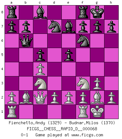 Last move : 0-1 2012 September 22 7:54:45 [Event "FICGS__CHESS__RAPID_D__000068"] [Site "FICGS"] [Date "2012.05.15"] [Round "1"] [White "Fienchetto,Andy"] [Black "Budnar,Milos"] [Result "0-1"] [WhiteElo "1329"] [BlackElo "1370"] 1.c4 Nf6 2.g3 e6 3.Bg2 d5 4.Nf3 Be7 5.O-O O-O 6.b3 dxc4 7.bxc4 c5 8.Bb2 Qb6 9.Qc2 Nbd7 10.Nc3 e5 0-1 This chess game has been lost on time (started : 2012.05.15 17:3:28) English, 1...Nf6 (Anglo-Indian defense) Kingside Castling by player White (move 5) Kingside Castling by player Black (move 5) Player Black won this chess game. Follow this game move after move (download)Chess is mental torture. (Garry Kasparov) Pläne sind die Träume des Verständigen. (Ernst Freiherr von Feuchtersleben) Aquel que toma al Peón de Caballo de la Reina, se pasará la noche a dormir en la calle. (Anónimo) Les écrivains ont utilisé les échecs pour analyser les côtés extrêmes de la nature humaine. Dans ce cadre, les échecs offrent un champ d'expérimentation idéal. Mais on pourrait faire la même chose avec la peinture. Et là, en vous référant à Van Gogh, vous ne tirerez pas de conclusion définitive sur les peintres. (Gary Kasparov) Memory is a crazy woman that hoards colored rags and throws away food. (Austin O'Malley)