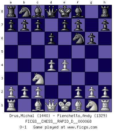 Last move : 0-1 2012 August 19 13:41:24 [Event "FICGS__CHESS__RAPID_D__000068"] [Site "FICGS"] [Date "2012.05.15"] [Round "1"] [White "Drus,Michal"] [Black "Fienchetto,Andy"] [Result "0-1"] [WhiteElo "1440"] [BlackElo "1329"] 1.e4 d6 2.d4 Nf6 3.Nc3 g6 0-1 This chess game has been lost on time (started : 2012.05.15 17:3:28) Pirc defense Player Black won this chess game. Follow this game move after move (download)In the perfect Chess combination as in a first-rate short story, the whole plot and counter-plot should lead up to a striking finale, the interest not being allayed until the very last moment. (Yates and Winter) Frage: Wie viele Autos haben Sie schon zerstört? - Antwort: Nur zwei. (Loek van Wely) El Rey es una pieza de pelea. ¡Usenlo!. (Wilhelm Steinitz) Les Echecs sont affaire de jugement sensible. Savoir quand frapper et quand esquiver. (Fischer) If we don't succeed, we run the risk of failure. (George W. Bush)