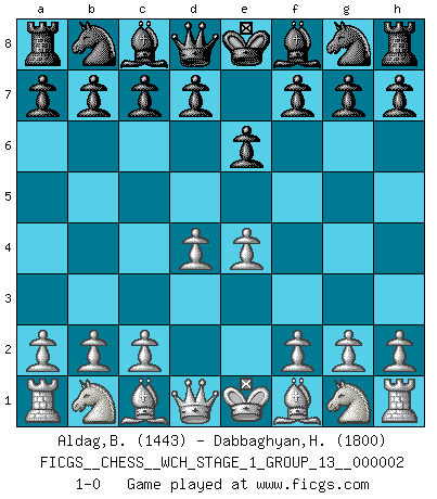 Last move : 1-0 2007 March 3 0:19:23 [Event "FICGS__CHESS__WCH_STAGE_1_GROUP_13__000002"] [Site "FICGS"] [Date "2007.01.16"] [Round "1"] [White "Aldag,Benjamin"] [Black "Dabbaghyan,Hossein"] [Result "1-0"] [WhiteElo "1443"] [BlackElo "1800"] 1.e4 e6 2.d4 1-0 This chess game has been lost on time (started : 2007.01.16 15:24:36) French defense Player White won this chess game. Follow this game move after move (download)Chess is in its essence a game, in its form an art, and in its execution a science. (Baron Tassilo) Schon mancher Spieler hat aufgegeben, um zu vermeiden, daß er eine Figur verliert. (Savielly Grigorievitsch Tartakower) Tu puedes aprender mucho mas de una partida que pierdas que de una partida ganada. Tendras que perder cientos de partidas antes de llegar a ser un buen jugador. (Jose Raul Capablanca) Je fais ceci parce que dans cinquante coups j'obtiendrai cela; je m'appelle Mikhail Moisevitch Botvinnik. (Botvinnik) I fear not the man who has practiced 10,000 kicks once, but I fear the man who has practiced one kick 10,000 times. (Bruce Lee)