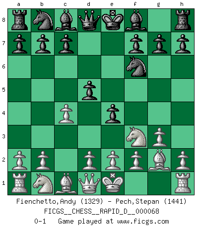 Last move : 0-1 2012 October 5 21:21:58 [Event "FICGS__CHESS__RAPID_D__000068"] [Site "FICGS"] [Date "2012.05.15"] [Round "1"] [White "Fienchetto,Andy"] [Black "Pech,Stepan"] [Result "0-1"] [WhiteElo "1329"] [BlackElo "1441"] 1.c4 Nf6 2.g3 e5 3.Bg2 d5 4.Nf3 e4 0-1 This chess game has been lost on time (started : 2012.05.15 17:3:28) English, 1...Nf6 (Anglo-Indian defense) Player Black won this chess game. Follow this game move after move (download)Modern Chess is too much concerned with things like Pawn structure. Forget it, Checkmate ends the game. (Nigel Short) Ein bischen Romantik kann weder im Schach noch in der Liebe schaden. Also versuche ich mich ab und zu daran zu erinnern. (Nigel Short) El Ajedrez era la lengua materna de Capablanca. (Reti) Les Echecs représentent une sphère d'idées créatrices basée sur la volonté des deux protagonistes. (Smyslov) Big Chess is a place for big hallucinations. (Thibault de Vassal)
