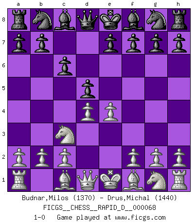 Last move : 1-0 2012 August 23 14:13:24 [Event "FICGS__CHESS__RAPID_D__000068"] [Site "FICGS"] [Date "2012.05.15"] [Round "1"] [White "Budnar,Milos"] [Black "Drus,Michal"] [Result "1-0"] [WhiteElo "1370"] [BlackElo "1440"] 1.e4 c6 2.d4 d5 3.Nc3 1-0 This chess game has been lost on time (started : 2012.05.15 17:3:28) Caro-Kann defense Player White won this chess game. Follow this game move after move (download)Chess is not like life... it has rules ! (Mark Pasternak) Mutter, ich bin eben Ex-Weltmeister geworden. --beim nach Hause Kommen nach dem Verlust des WM-Titels an Mihail Botvinnik -- (Mikhail Nekhemyevich Tal) En el Ajedrez, cuando menos, el valiente hereda la tierra. (Edmar Mednis) Un footballeur joue avec ses pieds, parfois avec sa tête. Un joueur d'échecs ne joue qu'avec sa tête. Et quand il ne joue plus, il meurt. (Jacob Murray) Only sick music makes money today. (Friedrich Nietzsche)