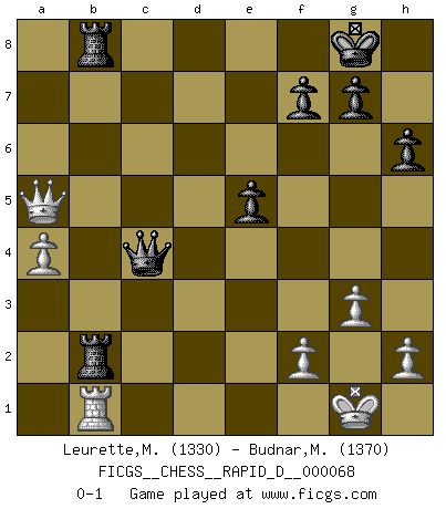 Last move : 0-1 2012 September 10 16:52:18 [Event "FICGS__CHESS__RAPID_D__000068"] [Site "FICGS"] [Date "2012.05.15"] [Round "1"] [White "Leurette,Marc-Antoine"] [Black "Budnar,Milos"] [Result "0-1"] [WhiteElo "1330"] [BlackElo "1370"] 1.e4 e5 2.Nf3 Nc6 3.Bc4 Nf6 4.Ng5 d5 5.exd5 Na5 6.Bb5+ c6 7.dxc6 bxc6 8.Ba4 Be7 9.d3 h6 10.Ne4 O-O 11.Nbc3 Bf5 12.O-O Bb4 13.Nxf6+ Qxf6 14.Ne4 Bxe4 15.dxe4 Bc5 16.Bxc6 Nxc6 17.c3 a5 18.a4 Qh4 19.Qe2 Qf6 20.c4 Nd4 21.Qd3 Rfb8 22.Rb1 Qg6 23.Be3 Nf3+ 24.Kh1 Bxe3 25.Qxe3 Nd4 26.g3 Rb3 27.Qe1 Qg4 28.Qd1 Qxe4+ 29.Kg1 Nf3+ 30.Kg2 Nd2+ 31.Kg1 Nxf1 32.Qxf1 Rab8 33.Qe1 Qxc4 34.Qxa5 Rxb2 0-1 Two knights defense Kingside Castling by player Black (move 10) Kingside Castling by player White (move 12) Player Black won this chess game. Follow this game move after move (download)Chess is a cold bath for the mind. (Sir John Simon) Ein Isolani verdüstert die Stimmung auf dem ganzen Schachbrett. (Savielly Grigorievitsch Tartakower) Cada Peón es potencialmente una Reina. (James Mason) Dans le domaine de la peinture, de la gravure et de la sculpture, dès la première décennie de notre siècle, les artistes abandonnent la représentation de la partie d'échecs pour se concentrer sur les pièces, sur les échiquiers et sur toutes les variations auxquelles les unes et les autres peuvent donner lieu. On passe en quelque sorte d'un thème social à un thème musical (au sens de la musica médiévale, c'est-à-dire d'une notion qui inclue le rythme, l'harmonie, la construction et la déconstruction, etc.). Graphiquement et picturalement, l'échiquier apparaît comme une structure ouverte, dynamique, d'une richesse infinie, autorisant toutes les combinatoires et débouchant sur des mouvements et des rythmes de nature exponentielle. (Michel Pastoureau) An expert is a man who has made all the mistakes which can be made in a very narrow field. (Niels Bohr)