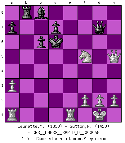 Last move : 1-0 2012 May 27 20:1:39 [Event "FICGS__CHESS__RAPID_D__000068"] [Site "FICGS"] [Date "2012.05.15"] [Round "1"] [White "Leurette,Marc-Antoine"] [Black "Sutton,Ray"] [Result "1-0"] [WhiteElo "1330"] [BlackElo "1429"] 1.e4 e5 2.Nf3 Nc6 3.Bc4 Bc5 4.d4 exd4 5.c3 Nf6 6.e5 Ne4 7.O-O O-O 8.cxd4 Be7 9.Nc3 Ng5 10.a3 Na5 11.b3 Nxc4 12.bxc4 c6 13.d5 h6 14.d6 Nxf3+ 15.Qxf3 Bg5 16.Ne4 Re8 17.Bxg5 hxg5 18.Qg3 f6 19.c5 b6 20.cxb6 Qxb6 21.Rfe1 Rb8 22.exf6 Qb2 23.Qxg5 Kf7 24.Qxg7+ Ke6 25.f7 Qxg7 26.fxe8Q+ Kf5 27.Qh5+ Ke6 28.Ng3 Kxd6 29.Nf5+ 1-0 Giuoco Piano Kingside Castling by player White (move 7) Kingside Castling by player Black (move 7) Promotion Queen by player White (move 26) Player White won this chess game. Follow this game move after move (download)I'd rather have a Pawn than a finger. (Reuben Fine) Wenn Spassky eine Figur opfert kannst du genauso gut aufgeben. Aber wenn Tal eine Figur opfert, spiel weiter. Er könnte noch eine weitere opfern, und dann ... wer weiß? (Miguel Najdorf) Todavía soy una víctima del Ajedrez. Tiene toda la belleza del arte y mucho mas. No puede ser comercializado. El Ajedrez es mas puro que el arte en su posición social. (Marcel Duchamp) La vie est comme un jeu d'échecs : nous esquissons un plan, mais celui-ci est tributaire de ce que daignent faire l'adversaire aux échecs et le destin dans la vie. (Arthur Schopenhauer) I'll be back. (Arnold Schwarzenegger)