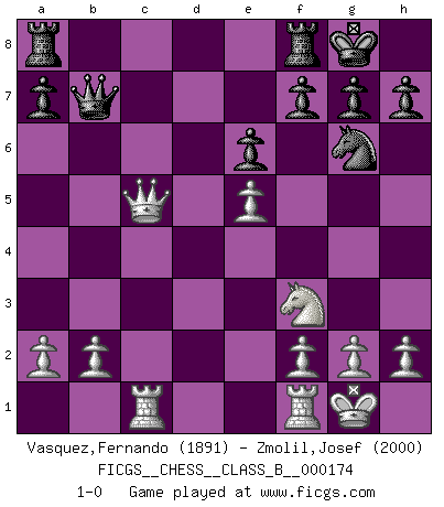 Last move : 1-0 2013 April 24 9:12:50 [Event "FICGS__CHESS__CLASS_B__000174"] [Site "FICGS"] [Date "2012.05.15"] [Round "1"] [White "Vasquez,Fernando"] [Black "Zmolil,Josef"] [Result "1-0"] [WhiteElo "1891"] [BlackElo "2000"] 1.e4 c6 2.d4 d5 3.e5 Bf5 4.Nf3 e6 5.Be2 c5 6.Be3 cxd4 7.Nxd4 Ne7 8.Nd2 Nbc6 9.N2f3 Be4 10.O-O Bxf3 11.Nxf3 Ng6 12.Bb5 Qc7 13.c4 dxc4 14.Rc1 Be7 15.Qa4 O-O 16.Bxc6 bxc6 17.Bd4 c5 18.Qxc4 Qb7 19.Bxc5 Bxc5 20.Qxc5 1-0 This chess game has been lost on time (started : 2012.05.15 19:59:53) Caro-Kann : Advance variation Kingside Castling by player White (move 10) Kingside Castling by player Black (move 15) Player White won this chess game. Follow this game move after move (download)Play the opening like a book, the middle game like a magician, and the endgame like a machine. (Spielmann) Jede Eröffnung ist gut genug um gespielt zu werden, wenn nur ihr Ruf schlecht genug ist. (Savielly Grigorievitsch Tartakower) La vida es como un juego de Ajedrez, cambiando con cada movimiento. (Proverbio Chino) Les Echecs sont affaire de jugement sensible. Savoir quand frapper et quand esquiver. (Fischer) God is an atheist. (Unknown)