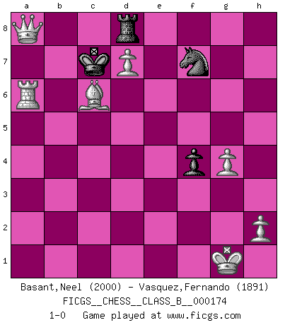 Last move : 1-0 2013 November 11 19:55:51 [Event "FICGS__CHESS__CLASS_B__000174"] [Site "FICGS"] [Date "2012.05.15"] [Round "1"] [White "Basant,Neel"] [Black "Vasquez,Fernando"] [Result "1-0"] [WhiteElo "2000"] [BlackElo "1891"] 1.e4 e5 2.Nf3 Nf6 3.Nxe5 d6 4.Nf3 Nxe4 5.d4 Be7 6.Bd3 d5 7.O-O Nc6 8.a3 O-O 9.c4 Be6 10.cxd5 Bxd5 11.Nc3 Nxc3 12.bxc3 Re8 13.Re1 Qd7 14.Be3 g6 15.Nd2 f5 16.Rb1 Bf6 17.Bb5 a6 18.Bf1 b6 19.Qc2 Na5 20.c4 Bc6 21.d5 Ba4 22.Qd3 Nb7 23.Nf3 Rad8 24.g3 Qg7 25.c5 Bb5 26.Rxb5 axb5 27.cxb6 cxb6 28.Qxb5 Nd6 29.Qxb6 Ne4 30.Rc1 Rb8 31.Qa6 Ra8 32.Qd3 Qd7 33.Rc6 Red8 34.Qb3 Rab8 35.Qc4 Nd6 36.Qf4 Be7 37.Bb6 Rdc8 38.Ne5 Qe8 39.Bc5 Rd8 40.Bd3 Rb3 41.Qd4 Bf8 42.a4 R3b8 43.a5 Bg7 44.f4 Bxe5 45.fxe5 Nb5 46.Qc4 Qxe5 47.Re6 Qc3 48.d6 Qxc4 49.Bxc4 Kg7 50.Re7+ Kf6 51.d7 Nd4 52.a6 Ra8 53.Rxh7 Ne6 54.Be7+ Ke5 55.Bxd8 Nxd8 56.Rg7 Ra7 57.Bb5 Kd6 58.Rg8 Kc7 59.Rxg6 Ra8 60.Rf6 f4 61.g4 Rb8 62.a7 Ra8 63.Ra6 Nf7 64.Bc6 Rd8 65.a8Q 1-0 Petrov : Classical attack Kingside Castling by player White (move 7) Kingside Castling by player Black (move 8) Promotion Queen by player White (move 65) Player White won this chess game. Follow this game move after move (download)A big shock; the best chess player in history has passed away. (Lajos Portisch, about Bobby Fischer's death) Mein Gehirn das ist mein zweitwichtigstes Organ [Aus dem Film: Der Schläfer]. (Woody Allen) No nos podemos resistir a la fascinación de un sacrificio ya que la pasión por los sacrificios es parte de la naturaleza de un jugador de Ajedrez. (Rudolf Spielman) Karpov est une pièce de musée. (Garry Kasparov) The greatest con, that he ever pulled... was making you believe... that he is you. (Revolver, movie)