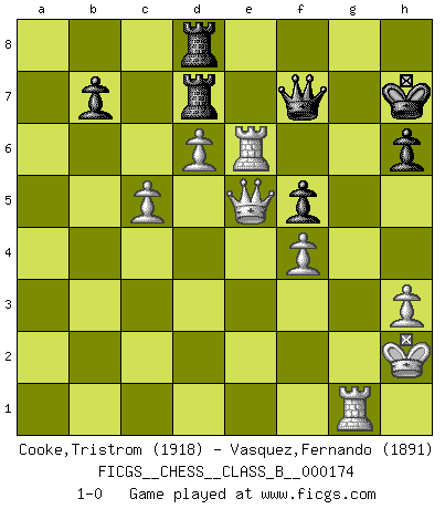 Last move : 1-0 2013 August 7 10:32:19 [Event "FICGS__CHESS__CLASS_B__000174"] [Site "FICGS"] [Date "2012.05.15"] [Round "1"] [White "Cooke,Tristrom"] [Black "Vasquez,Fernando"] [Result "1-0"] [WhiteElo "1918"] [BlackElo "1891"] 1.e4 e5 2.Nf3 Nf6 3.Nxe5 d6 4.Nf3 Nxe4 5.d3 Nf6 6.Be2 Be7 7.Nc3 O-O 8.O-O d5 9.d4 Ne4 10.Bf4 c6 11.Nxe4 dxe4 12.Ne5 Nd7 13.Nxd7 Bxd7 14.Bc4 Bf5 15.Qd2 Qd7 16.Qe3 Bd6 17.Rfd1 Rad8 18.d5 a6 19.h3 h6 20.Bxd6 Qxd6 21.c3 c5 22.a4 Bg6 23.a5 f5 24.f4 Bh5 25.Rd2 Rf6 26.Bb3 Kh7 27.c4 Kg8 28.Bd1 Bxd1 29.R2xd1 Qe7 30.b4 cxb4 31.c5 Qe8 32.d6 Qb5 33.Qd4 Rf7 34.Rab1 Qxa5 35.Rxb4 R8d7 36.Rdb1 Qa2 37.Kh2 Kh7 38.R4b3 Qe2 39.R3b2 Qh5 40.Qd5 Qh4 41.Qe5 a5 42.g3 Qd8 43.g4 g6 44.gxf5 gxf5 45.Rg2 a4 46.Rbg1 a3 47.Rg6 a2 48.Re6 Qh4 49.Re8 Qf6 50.Ra8 Rf8 51.Rxa2 e3 52.Ra3 Qf7 53.Rxe3 Ra8 54.Reg3 Ra2+ 55.Kh1 Ra8 56.Rg6 Rf8 57.Re6 Rfd8 58.Kh2 1-0 Petrov : French attack Kingside Castling by player Black (move 7) Kingside Castling by player White (move 8) Player White won this chess game. Follow this game move after move (download)During a Chess competition a Chessmaster should be a combination of a beast of prey and a monk. (Alexander Alekhine) Ich verstehe den Grund nicht, warum die Aufteilung in Frauen und Männer überhaupt im Schach besteht. (Judith Polgar) Fischer deseaba darle a los Rusos una sopa de su propia medicina. (Larry Evans) Le génie consiste à savoir transgresser les règles au moment opportun. (Teichmann) Gambling : The sure way of getting nothing from something. (Wilson Mizner)