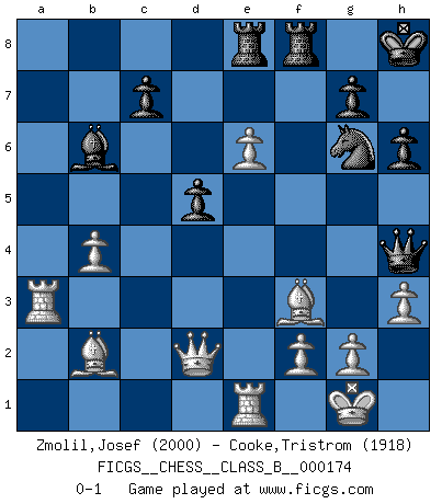 Last move : 0-1 2013 May 21 13:37:59 [Event "FICGS__CHESS__CLASS_B__000174"] [Site "FICGS"] [Date "2012.05.15"] [Round "1"] [White "Zmolil,Josef"] [Black "Cooke,Tristrom"] [Result "0-1"] [WhiteElo "2000"] [BlackElo "1918"] 1.e4 e5 2.Nf3 Nc6 3.Bb5 Bc5 4.c3 Nge7 5.O-O a6 6.Ba4 b5 7.Bb3 O-O 8.d4 exd4 9.cxd4 Bb6 10.Nc3 d6 11.h3 Na5 12.Bc2 f6 13.b4 Nac6 14.a3 Kh8 15.Re1 a5 16.Rb1 axb4 17.axb4 h6 18.Nxb5 f5 19.d5 fxe4 20.Bxe4 Ne5 21.Nbd4 Nf5 22.Ne6 Bxe6 23.dxe6 Nxf3+ 24.Bxf3 Qh4 25.Qd2 d5 26.Bb2 Ne7 27.Ra1 Rae8 28.Ra3 Ng6 29.Kf1 Qc4+ 30.Kg1 Qh4 0-1 Ruy Lopez : Classical defense, 4.c3 Kingside Castling by player White (move 5) Kingside Castling by player Black (move 7) Player Black won this chess game. Follow this game move after move (download)A great player and a great example for many. His book My 60 Memorable Games had a big impact on me. It is a shame he didn't continue to enrich the world of chess with his unparalleled understanding after 1972. (Jan Timman, about Bobby Fischer's death) Wie, soll nun auch die Opposition abgeschafft werden? Ja, es tut mir leid, Ihnen diesen Schmerz nicht ersparen zu können. (Aaron Nimzowitsch) El Ajedrez es un cuento de Hadas de las 1001 metidas de pata. (Savielly Tartakower) A chaque perte on perd un peu de soi. (Joël Lautier) They misunderestimated me. (George W. Bush, Bentonville nov. 6, 2000)