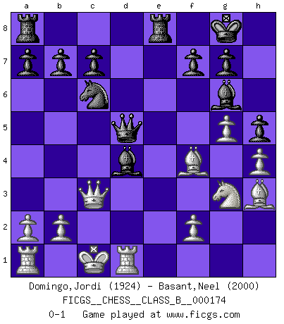 Last move : 0-1 2013 May 29 23:16:39 [Event "FICGS__CHESS__CLASS_B__000174"] [Site "FICGS"] [Date "2012.05.15"] [Round "1"] [White "Domingo,Jordi"] [Black "Basant,Neel"] [Result "0-1"] [WhiteElo "1924"] [BlackElo "2000"] 1.g4 d5 2.Bg2 e5 3.h3 h5 4.g5 Be6 5.d4 exd4 6.Qxd4 Nc6 7.Qa4 Bc5 8.Nf3 Nge7 9.Ne5 O-O 10.Nd3 Bb6 11.Nd2 Bd7 12.c3 Ne5 13.Qc2 Bf5 14.Nf1 N7c6 15.Bf4 Nxd3+ 16.exd3 Re8+ 17.Kd1 Bg6 18.h4 Qd7 19.Bh3 Bf5 20.Bg2 d4 21.Ng3 dxc3 22.Qxc3 Bxd3 23.Kc1 Bg6 24.Bh3 Qd5 25.Rd1 Bd4 0-1 Grob's attack Kingside Castling by player Black (move 9) Player Black won this chess game. Follow this game move after move (download)I like the moment when I break a man's ego. (Bobby Fischer) Es gibt Leute, die glauben, alles wäre vernünftig, was man mit einem ernsthaften Gesicht tut. (Georg Christoph Lichtenberg) Coloca el contenido del tablero de Ajedrez en un sombrero, agita las piezas vigorosamente, derrámalas en el tablero desde una altura de medio metro y así obtienes el estilo de Wilhelm Steinitz. (H. E. Bird) J'apprécie les joueurs d'est-indienne, c'est grâce à eux que je nourris ma famille depuis tant d'années. (Petrosian) Fortune favours the audacious. (Desiderius Erasmus)