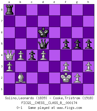 Last move : 0-1 2013 May 16 10:45:9 [Event "FICGS__CHESS__CLASS_B__000174"] [Site "FICGS"] [Date "2012.05.15"] [Round "1"] [White "Solino,Leonardo"] [Black "Cooke,Tristrom"] [Result "0-1"] [WhiteElo "1839"] [BlackElo "1918"] 1.e4 e5 2.Nf3 Nc6 3.Bb5 Bc5 4.O-O d6 5.c3 a6 6.Bxc6+ bxc6 7.d4 exd4 8.cxd4 Bb6 9.Nc3 Ne7 10.Be3 O-O 11.Qd3 d5 12.Rac1 Bg4 13.Ne5 Bh5 14.Na4 f6 15.Nxb6 cxb6 16.Nxc6 Nxc6 17.Rxc6 Be8 18.exd5 Qxd5 19.Rxb6 Bb5 20.Rxb5 axb5 21.a3 Ra4 22.Rc1 Rc4 23.h3 Rfc8 24.Rxc4 bxc4 25.Qc3 Rb8 26.Qc2 Rb6 27.b4 g6 28.Qc3 Ra6 29.Bc1 Kf7 30.Bb2 Ke8 31.Qc2 Kd7 32.f3 Qb5 33.Bc1 Ra8 34.Kf2 Qd5 35.Qc3 h5 36.Bb2 g5 37.Kf1 f5 38.Kf2 Re8 39.Qc2 Kd6 40.Qa4 Ra8 0-1 This chess game has been lost on time (started : 2012.05.15 19:59:53) Ruy Lopez : Classical (Cordel) defense Kingside Castling by player White (move 4) Kingside Castling by player Black (move 10) Player Black won this chess game. Follow this game move after move (download)Let the perfectionist play postal. (Yasser Seirawan) Der Freibauer hat für mich eine Seele, genau wie der Mensch, Wünsche, die unerkannt in ihm schlummern, und Befürchtungen, von deren Existenz er selbst kaum ahnt. (Aaron Nimzowitsch) Cuando estes solo, cuando te sientas un extraño en el mundo, juega al Ajedrez. Esto levantará tu espiritu y será tu consejero de guerra. (Aristóteles) On est toujours la mazette de quelqu'un d'autre. (Anonyme) There's always a bigger fish. (Qui-Gon Jinn in Star Wars ep.1)