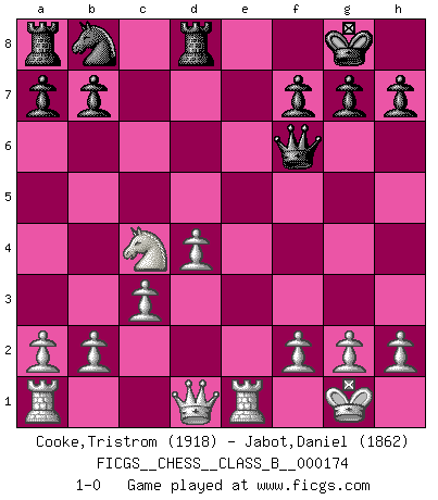 Last move : 1-0 2012 September 16 18:26:1 [Event "FICGS__CHESS__CLASS_B__000174"] [Site "FICGS"] [Date "2012.05.15"] [Round "1"] [White "Cooke,Tristrom"] [Black "Jabot,Daniel"] [Result "1-0"] [WhiteElo "1918"] [BlackElo "1862"] 1.e4 c5 2.Bc4 e6 3.Nf3 d5 4.Bb5+ Bd7 5.Bxd7+ Qxd7 6.exd5 exd5 7.d4 c4 8.Ne5 Qe6 9.O-O Be7 10.Re1 Qc8 11.Nc3 Nf6 12.Bg5 O-O 13.Bxf6 Bxf6 14.Nxd5 Qd8 15.Nxf6+ Qxf6 16.c3 Rd8 17.Nxc4 1-0 Sicilian defense Kingside Castling by player White (move 9) Kingside Castling by player Black (move 12) Player White won this chess game. Follow this game move after move (download)Whoever sees no other aim in the game than that of giving checkmate to one's opponent will never become a good Chess player. (Euwe) Darum geht es im Schach. Einen Tag gibst du deinem Gegner eine Lektion, am nächsten Tag gibt er dir eine. (Robert James Fischer) Con o sin el título, Bobby Fischer fue sin lugar a dudas el mas grande jugador de su época. (Burt Hochberg) Il s'avisa de me proposer d'apprendre les échecs qu'il jouait un peu... me voilà forcené des échecs. J'achète un échiquier, je m'enferme dans ma chambre, j'y passe des jours et des nuits à vouloir apprendre par cur toutes les parties. (Jean-Jacques Rousseau, Confessions) The only difference between a tax man and a taxidermist is that the taxidermist leaves the skin. (Mark Twain)