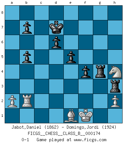 Last move : 0-1 2012 November 11 15:58:13 [Event "FICGS__CHESS__CLASS_B__000174"] [Site "FICGS"] [Date "2012.05.15"] [Round "1"] [White "Jabot,Daniel"] [Black "Domingo,Jordi"] [Result "0-1"] [WhiteElo "1862"] [BlackElo "1924"] 1.e4 h6 2.d4 c5 3.Nf3 cxd4 4.Nxd4 a6 5.c4 Nf6 6.Nc3 d6 7.Bd3 Nbd7 8.O-O g5 9.f4 gxf4 10.Kh1 e5 11.Nf3 h5 12.b4 h4 13.Nd5 h3 14.Rf2 Nxd5 15.cxd5 Qb6 16.Rb2 hxg2+ 17.Rxg2 Nf6 18.Bd2 Bh3 19.Re2 Bg4 20.Rg2 Rh3 21.Be2 Nxe4 22.Be1 f5 23.Nh4 Nf6 24.Rxg4 fxg4 25.Bxg4 Ra3 26.Qc2 Nxg4 27.Qg6+ Kd8 28.Qf7 Qb5 29.Qxf8+ Kc7 30.Qg7+ Kb6 31.Qxg4 Qxd5+ 32.Qg2 Qxg2+ 33.Kxg2 Kc6 34.Rc1+ Kd7 35.Rc2 Rg8+ 36.Kf1 Rg4 37.b5 axb5 38.Rb2 Rh3 0-1 Carr's defense Kingside Castling by player White (move 8) Player Black won this chess game. Follow this game move after move (download)Fischer is an American Chess tragedy on par with Morphy and Pillsbury. (Mig Greengard) Oft bringt ein stiller Zug das Erdbeben. (Richard Reti) La belleza de un movimiento no se refleja solo en su apariencia, sino en el pensamiento detrás de él. (Siegbert Tarrasch) Les Echecs sont affaire de jugement sensible. Savoir quand frapper et quand esquiver. (Fischer) Inventor: A person who makes an ingenious arrangement of wheels, levers and springs, and believes it civilization. (Ambrose Bierce, The Devil's Dictionary)